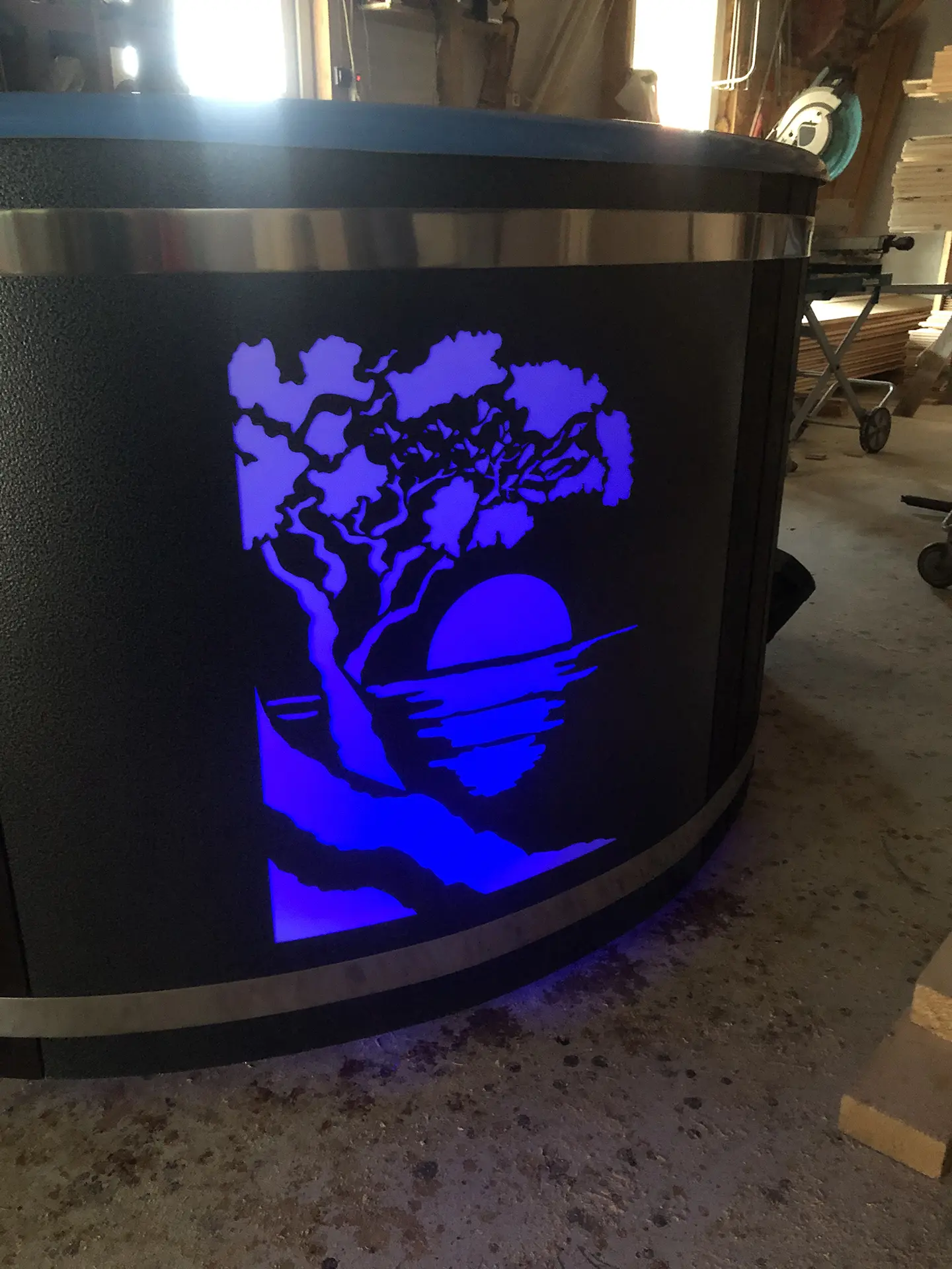 Lauko kubilai su išorine arba integruota krosnele, hidro ir arba oro sistemomis, Led apšvietimu, laiptai, bariukas, dangtis, apšiltintas.